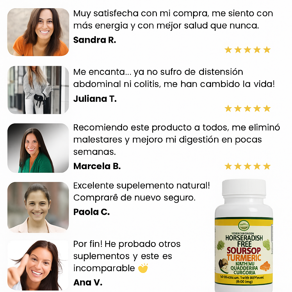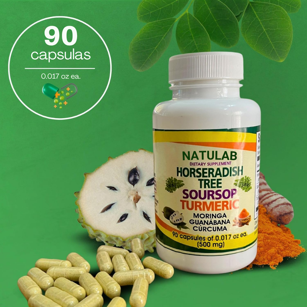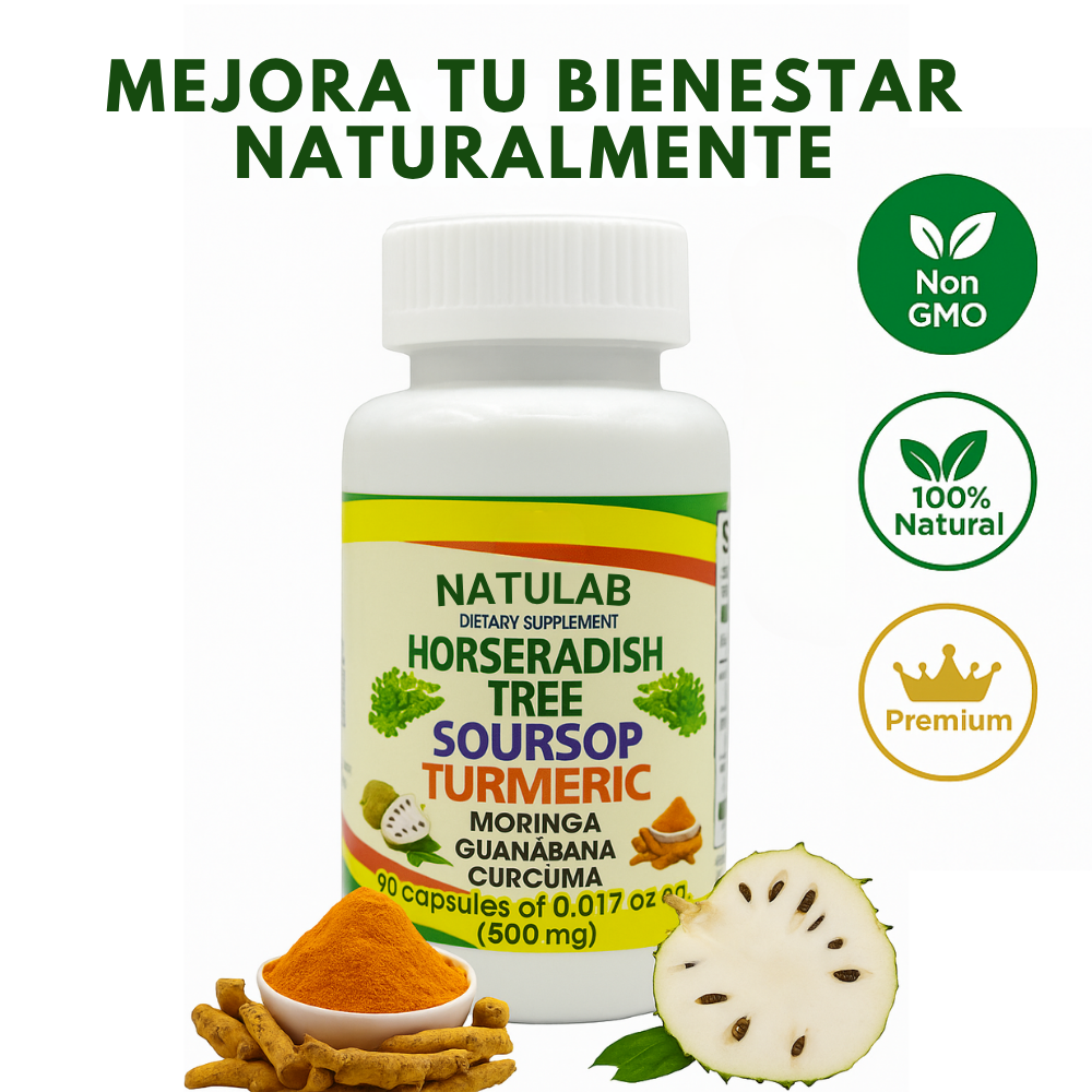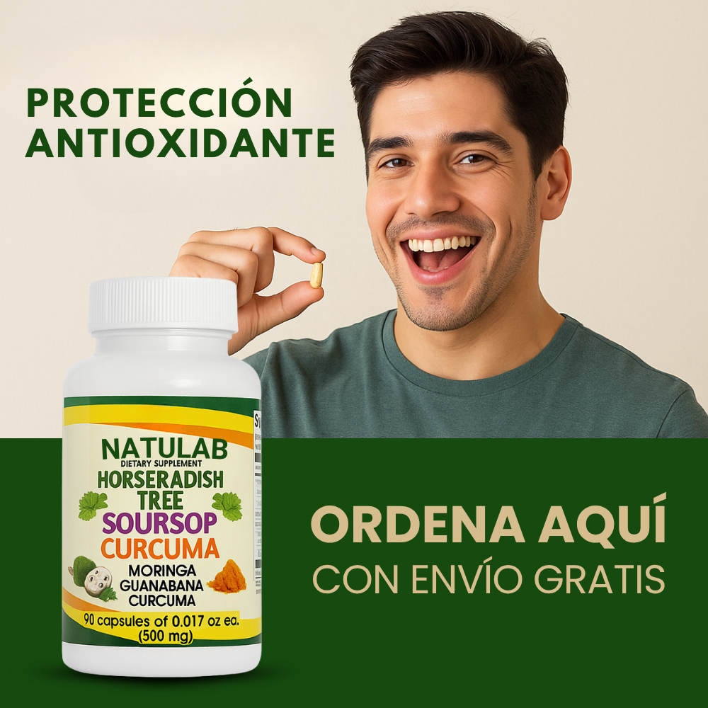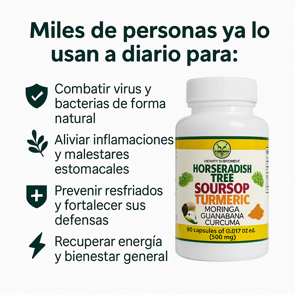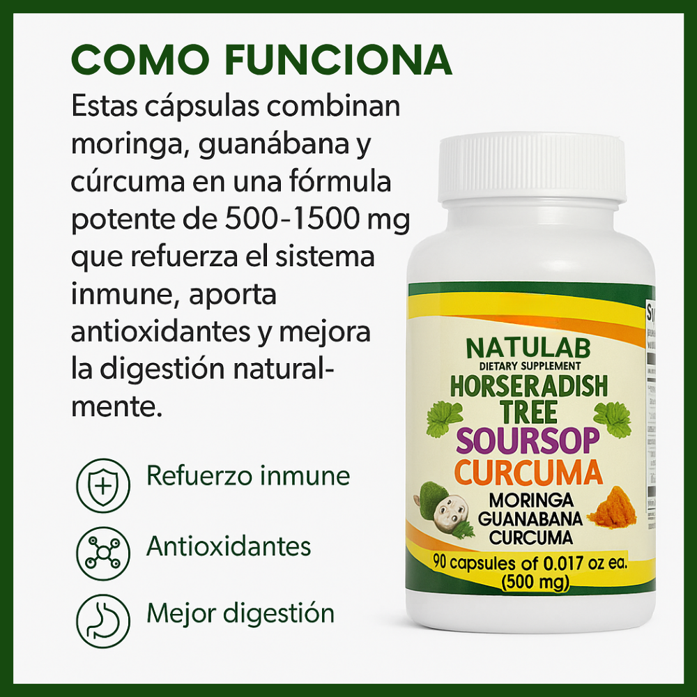 El suplemento Moringa Guanábana Cúrcuma funciona gracias a la sinergia de tres ingredientes naturales que ofrecen múltiples beneficios para la salud. La moringa y la guanábana son ricas en antioxidantes, vitaminas (como la C y E) y compuestos antiinflamatorios que ayudan a fortalecer las defensas del cuerpo frente a virus y bacterias.
